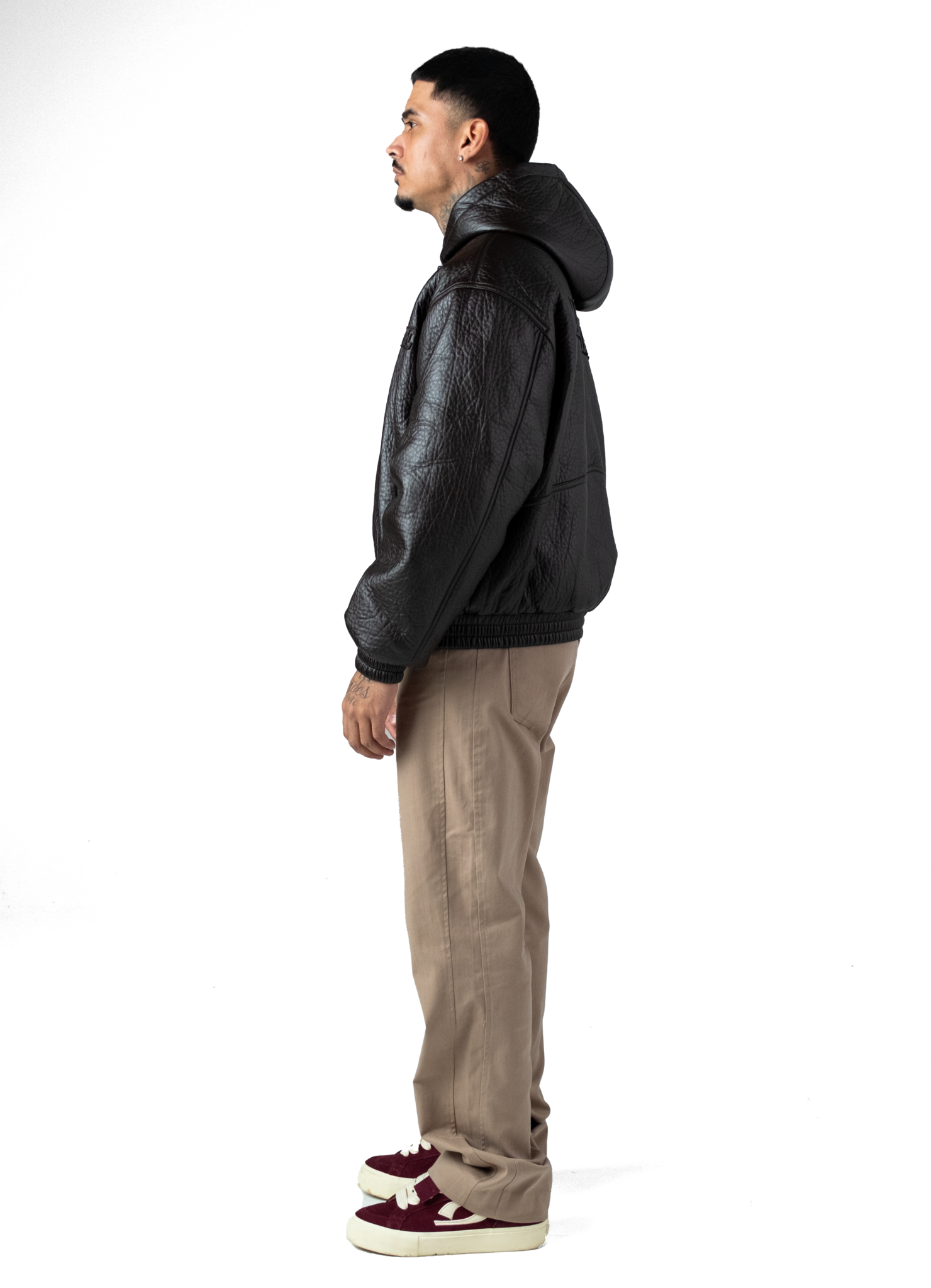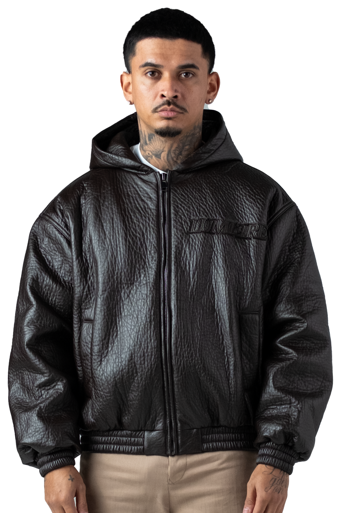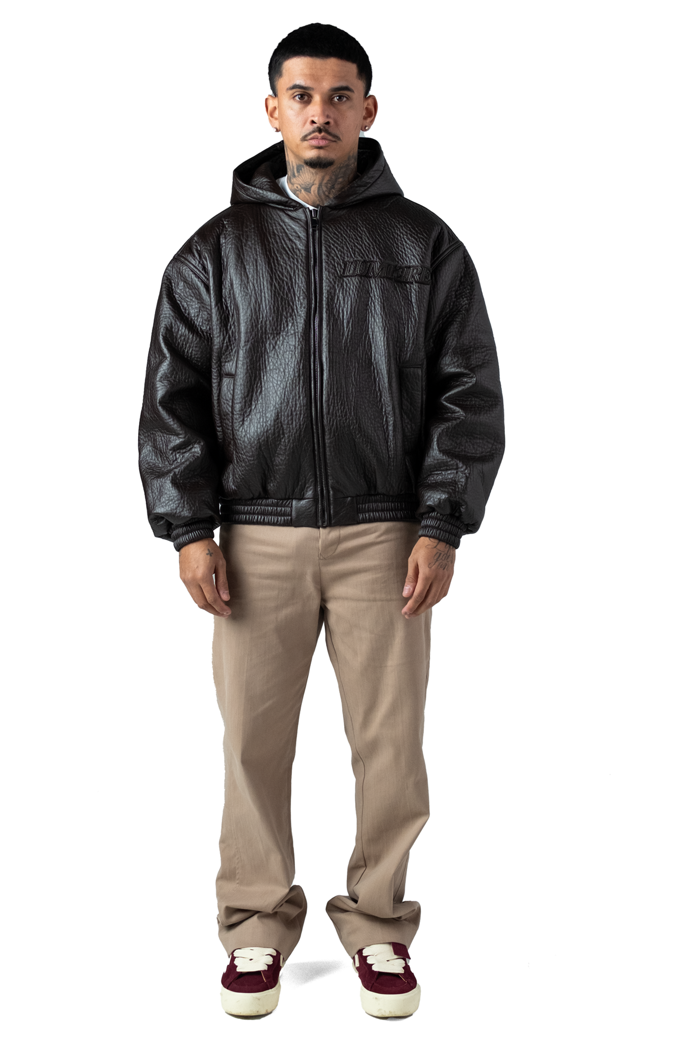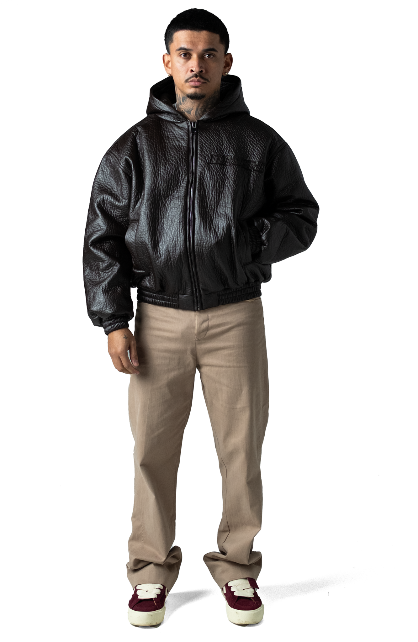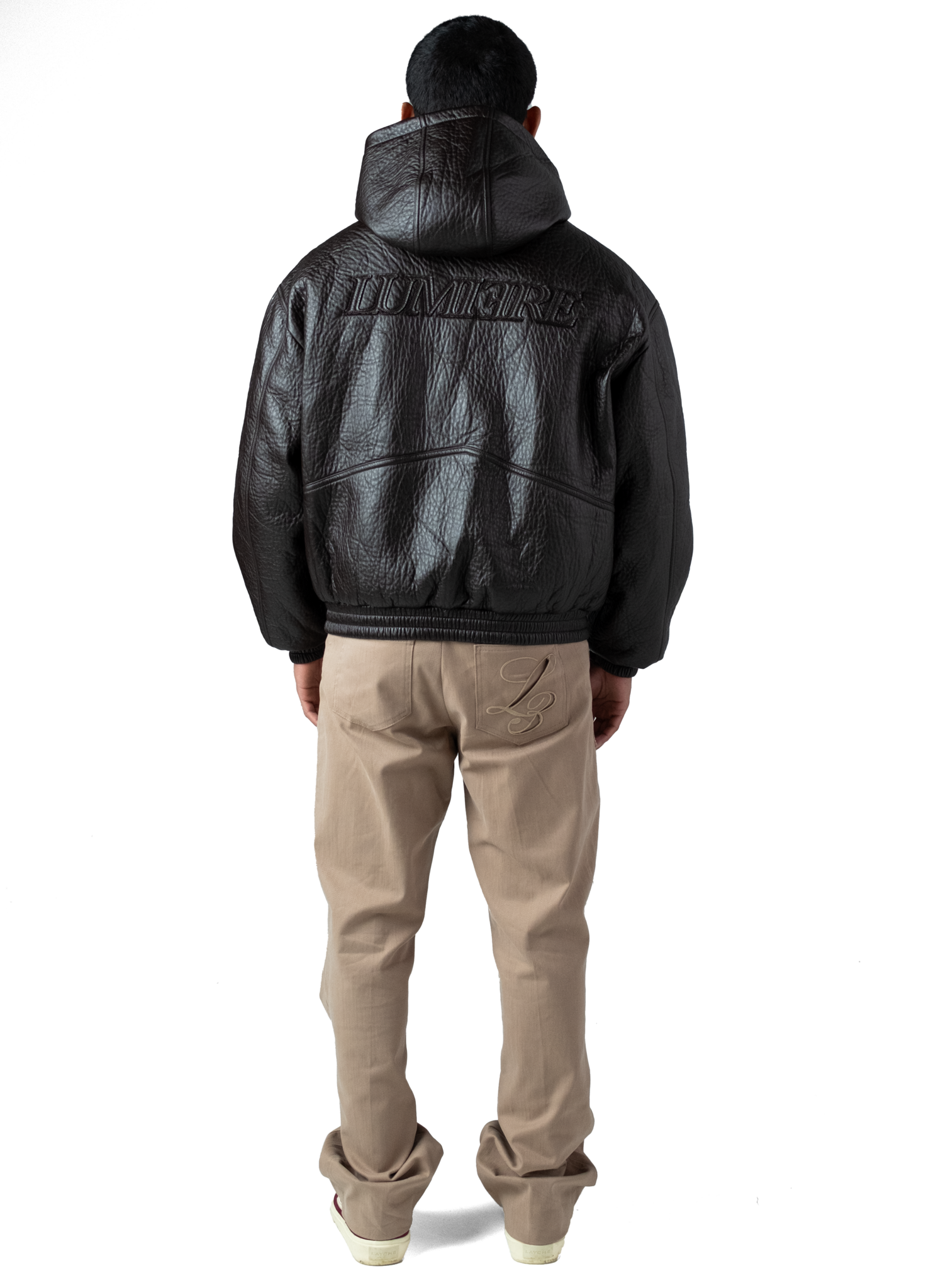 The Brown Puffed Hooded Leather Bomber Jacket combines bold design with everyday comfort. Crafted from soft vegan leather, this relaxed-fit bomber includes a functional hood for extra warmth and versatility. The embroidered Lumi3re logo adds a signature touch, making it a standout piece for modern layering and streetwear styling.