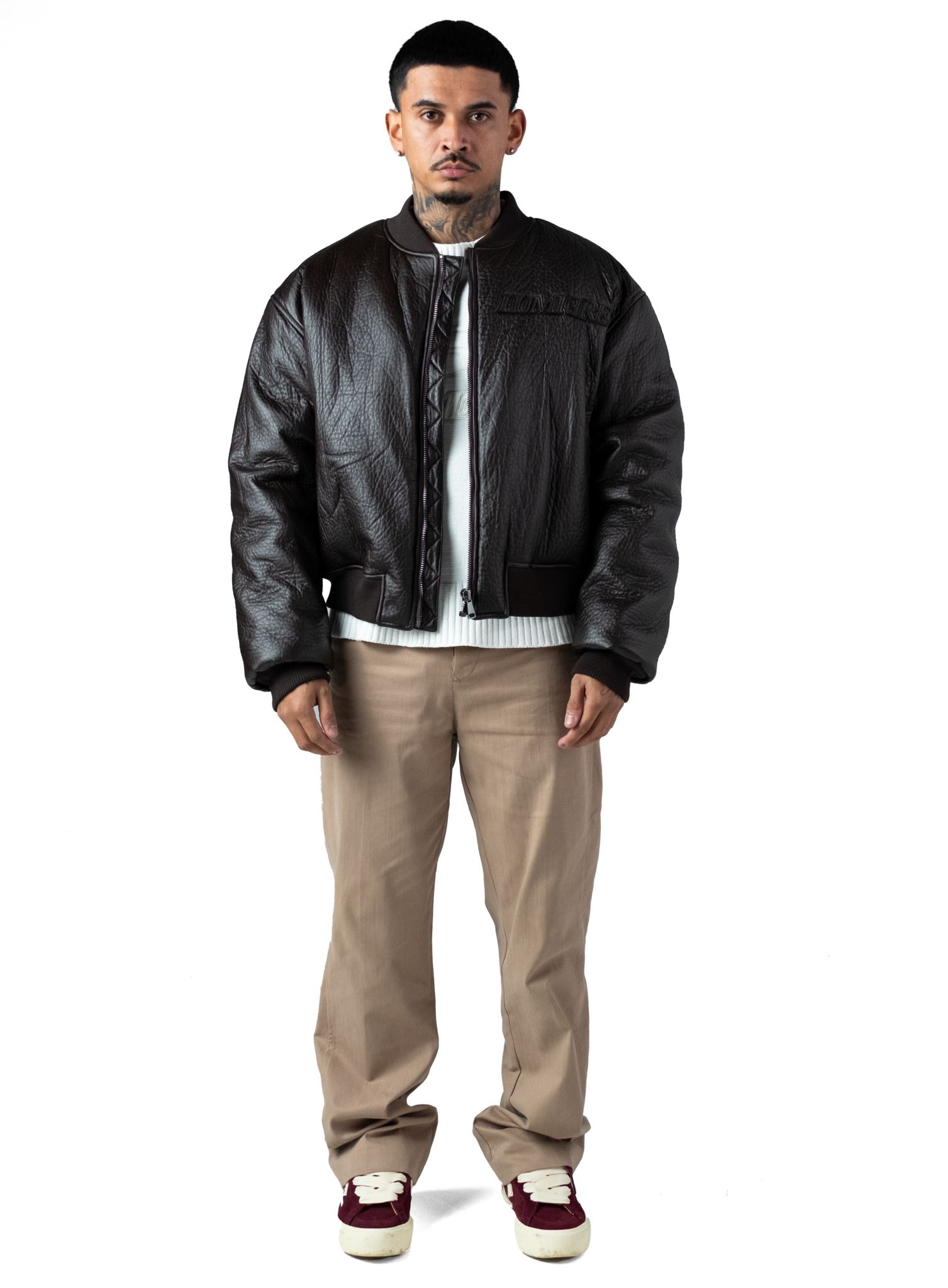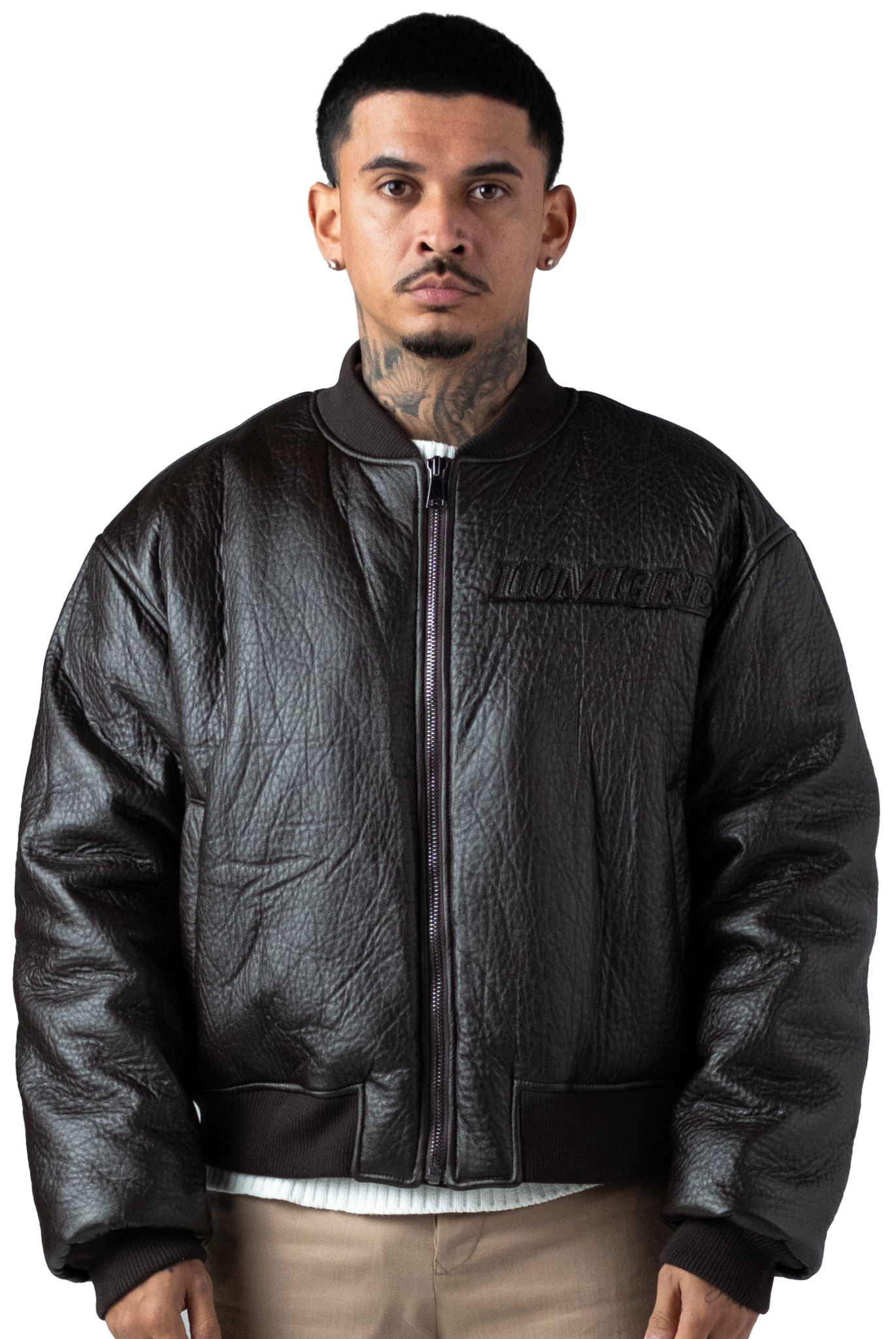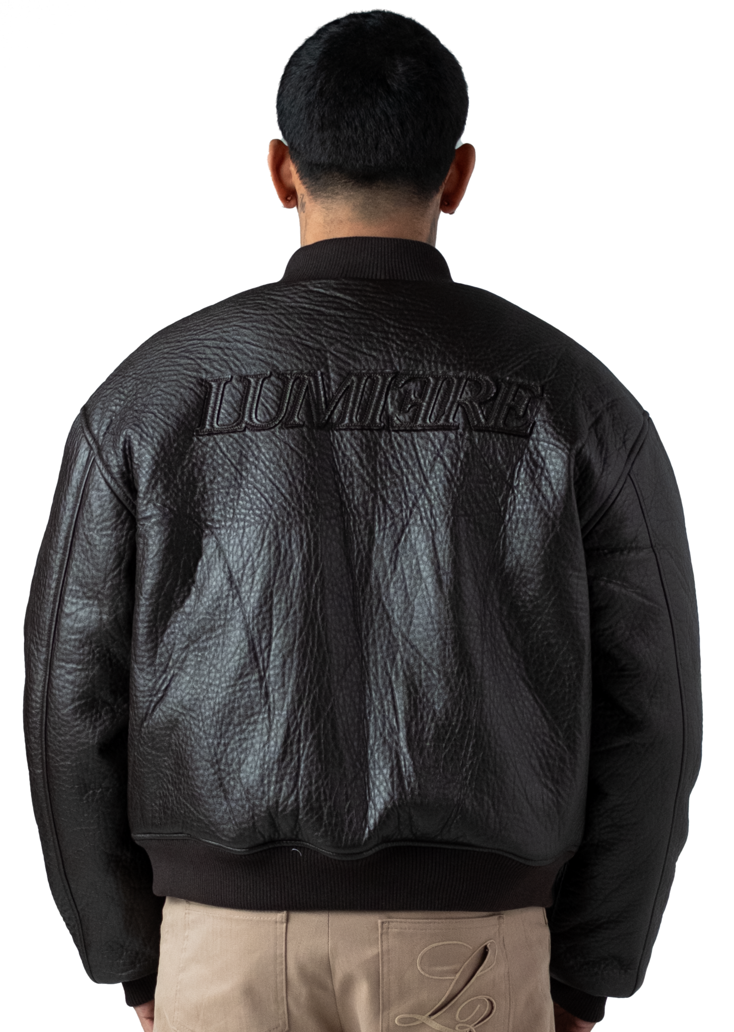 The Brown Puffed Leather Bomber Jacket delivers a premium streetwear aesthetic with a modern twist. Made from high-quality vegan leather, it features a relaxed fit that provides both comfort and structure. This hoodless bomber is finished with the embroidered Lumi3re logo on the chest, offering a clean, sophisticated look that elevates any outfit.