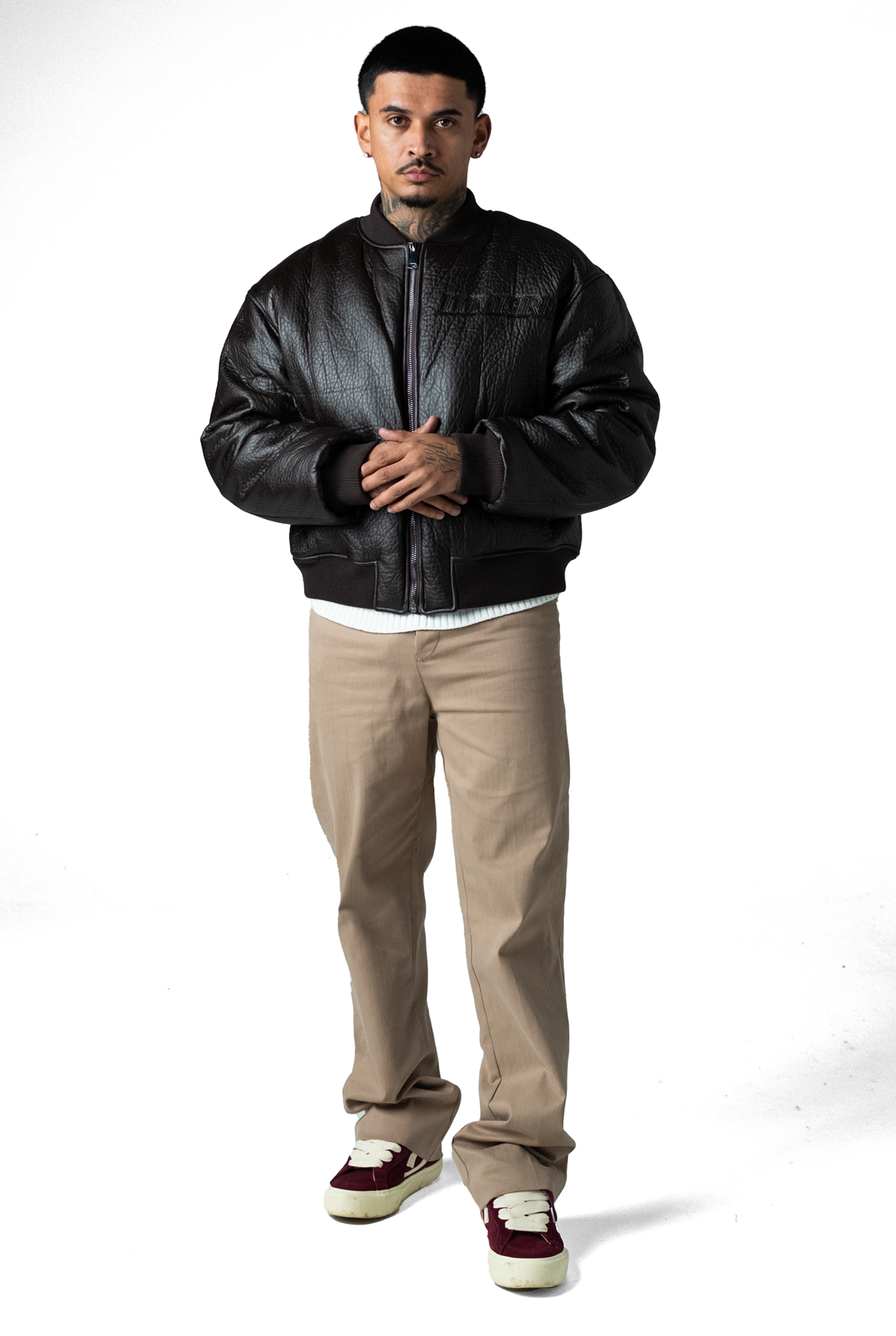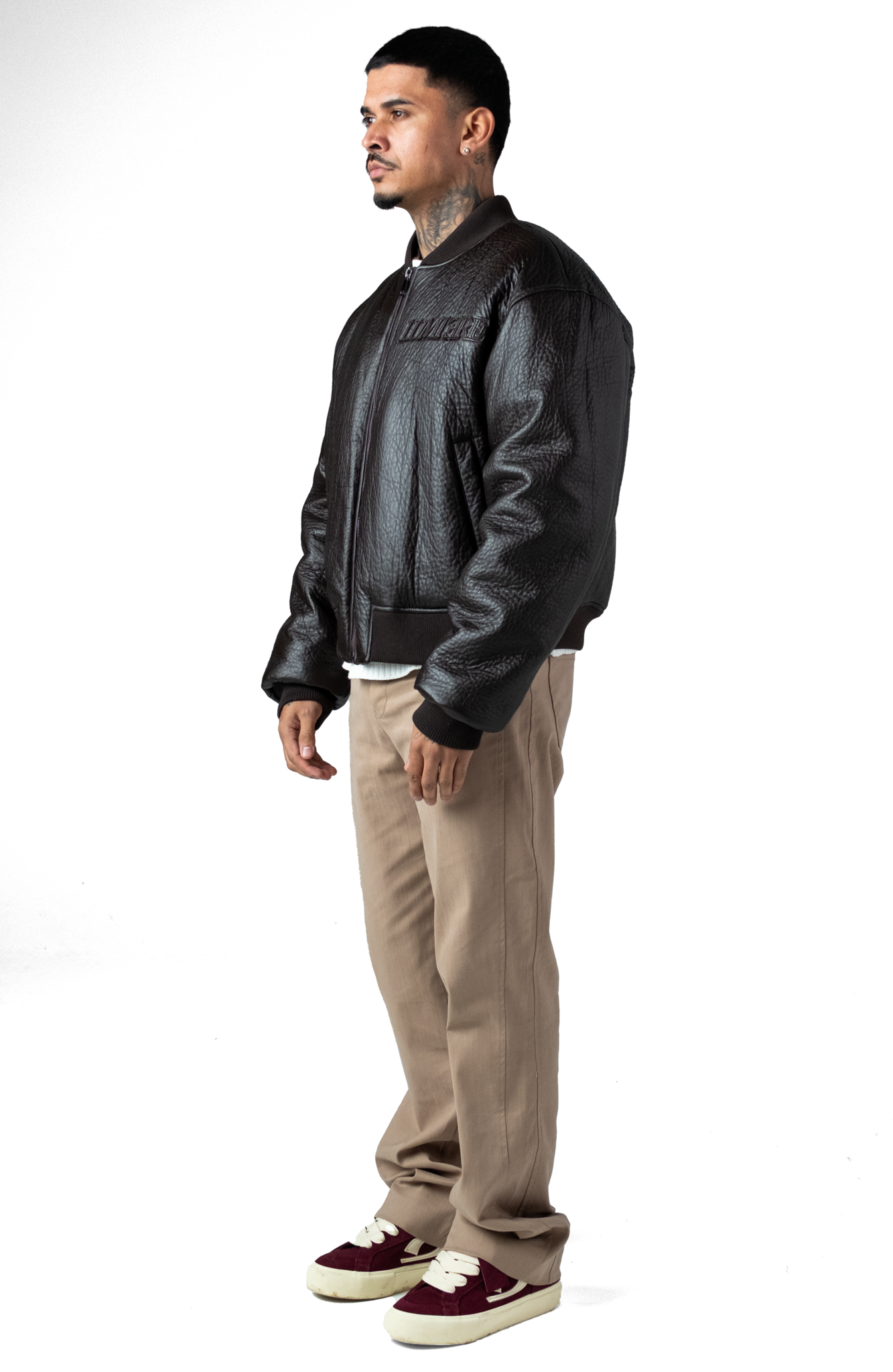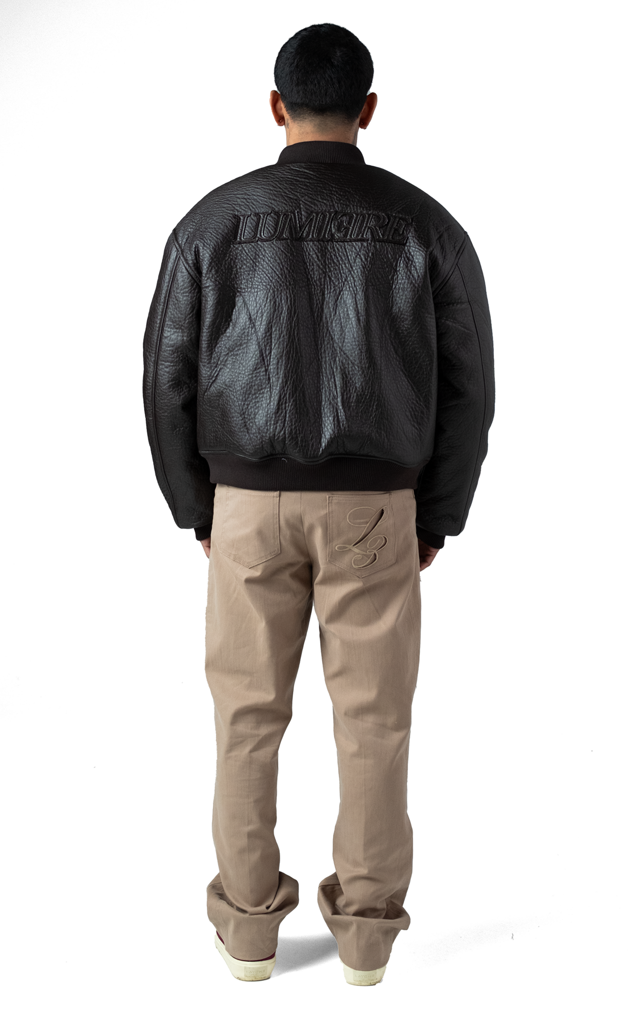 The Brown Puffed Leather Bomber Jacket delivers a premium streetwear aesthetic with a modern twist. Made from high-quality vegan leather, it features a relaxed fit that provides both comfort and structure. This hoodless bomber is finished with the embroidered Lumi3re logo on the chest, offering a clean, sophisticated look that elevates any outfit.