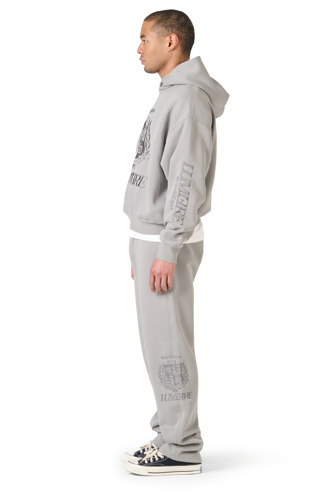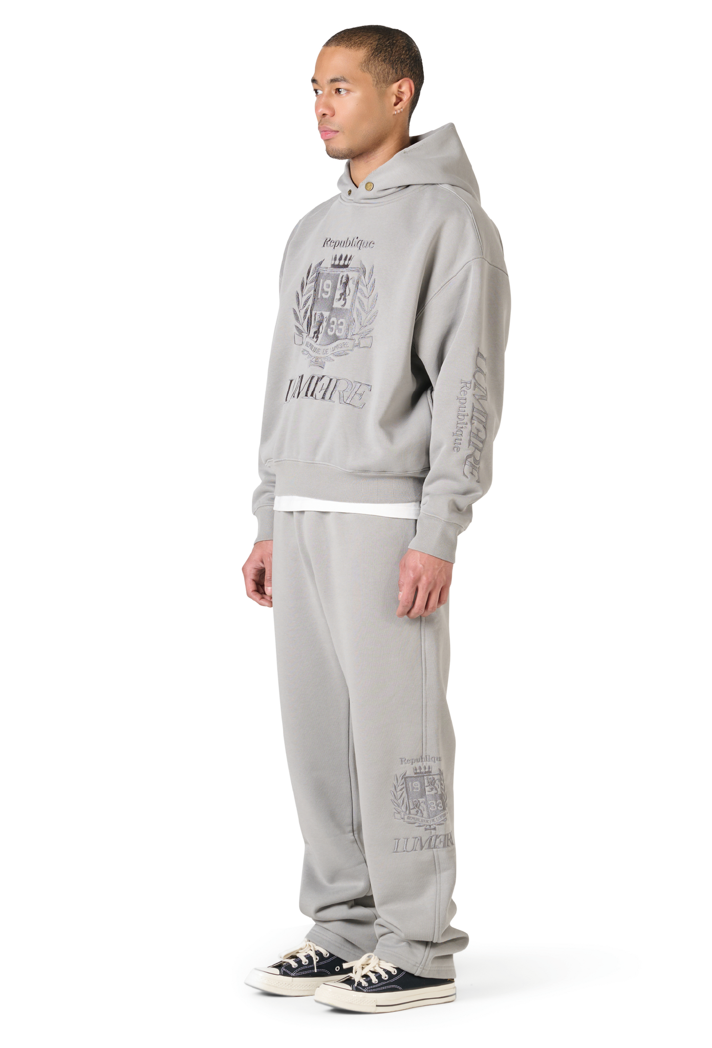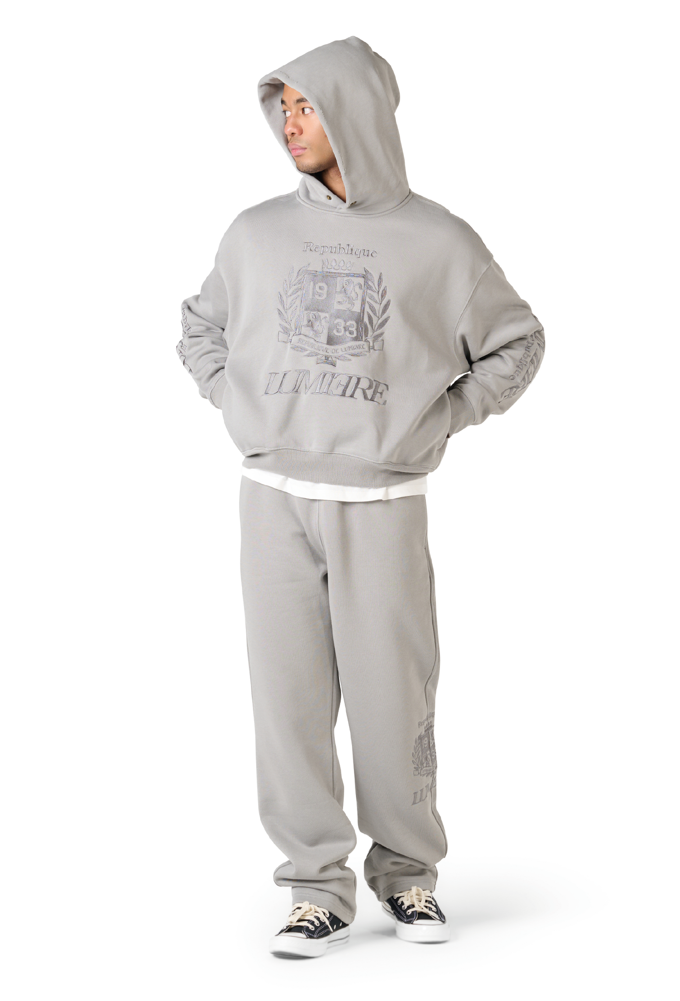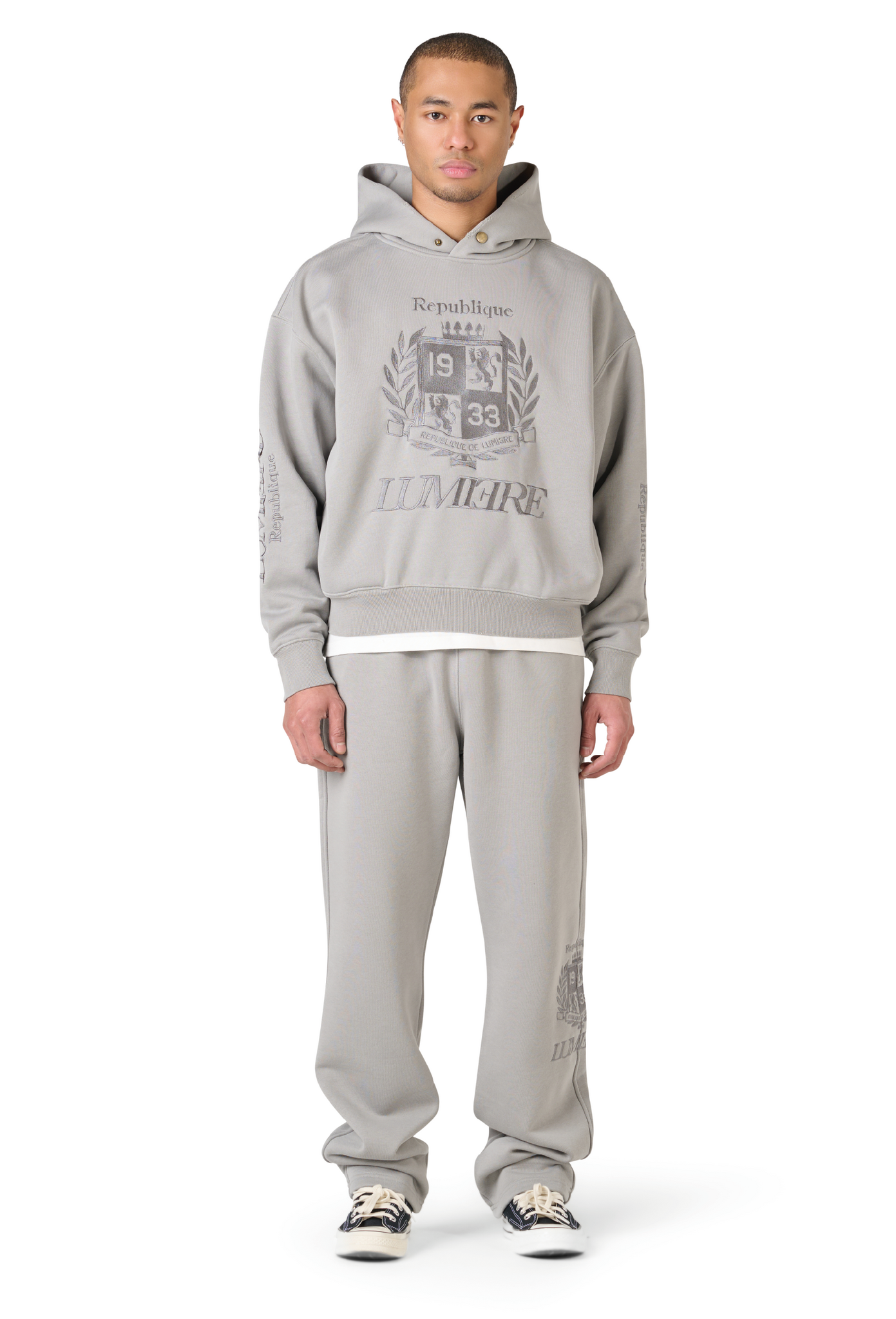 The Republique Washed Tracksuit Grey is designed for all-day comfort with a premium streetwear edge. Crafted in a washed grey color, this tracksuit features a high-quality 380G cotton-polyester blend and a regular fit, making it ideal for everyday wear during spring.The iconic Lumi3re Republique logo is embroidered on the front and both sleeves, delivering a clean and recognizable finish. A standout essential that blends luxury and modern street style effortlessly.