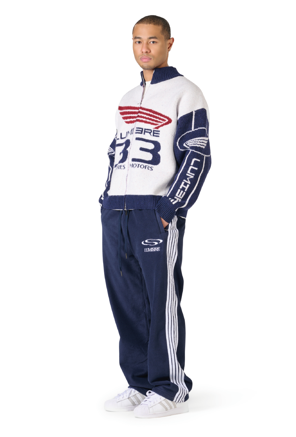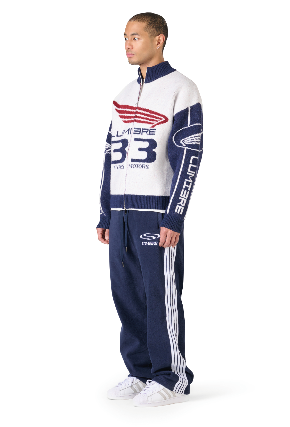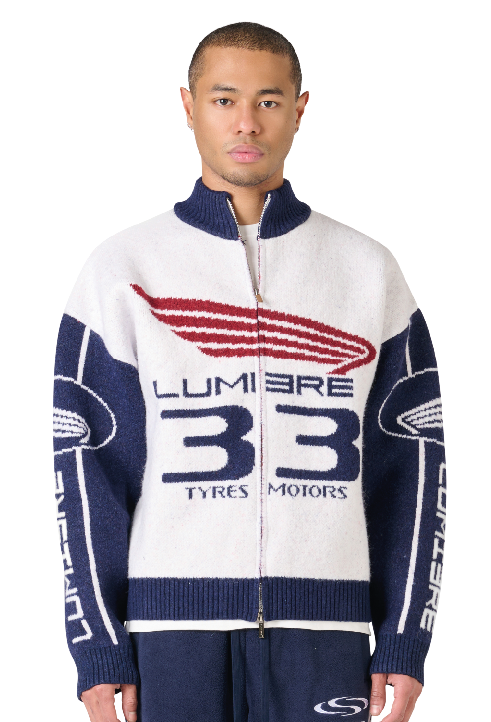 The Knitted Tyres Jacket is a timeless essential within the collection. Sharing the same fit and high-collar design as the Race Jacket, it features a structured silhouette, zipper closure, and multiple Lumi3re logos. The white and navy colorway delivers a clean, classic finish.