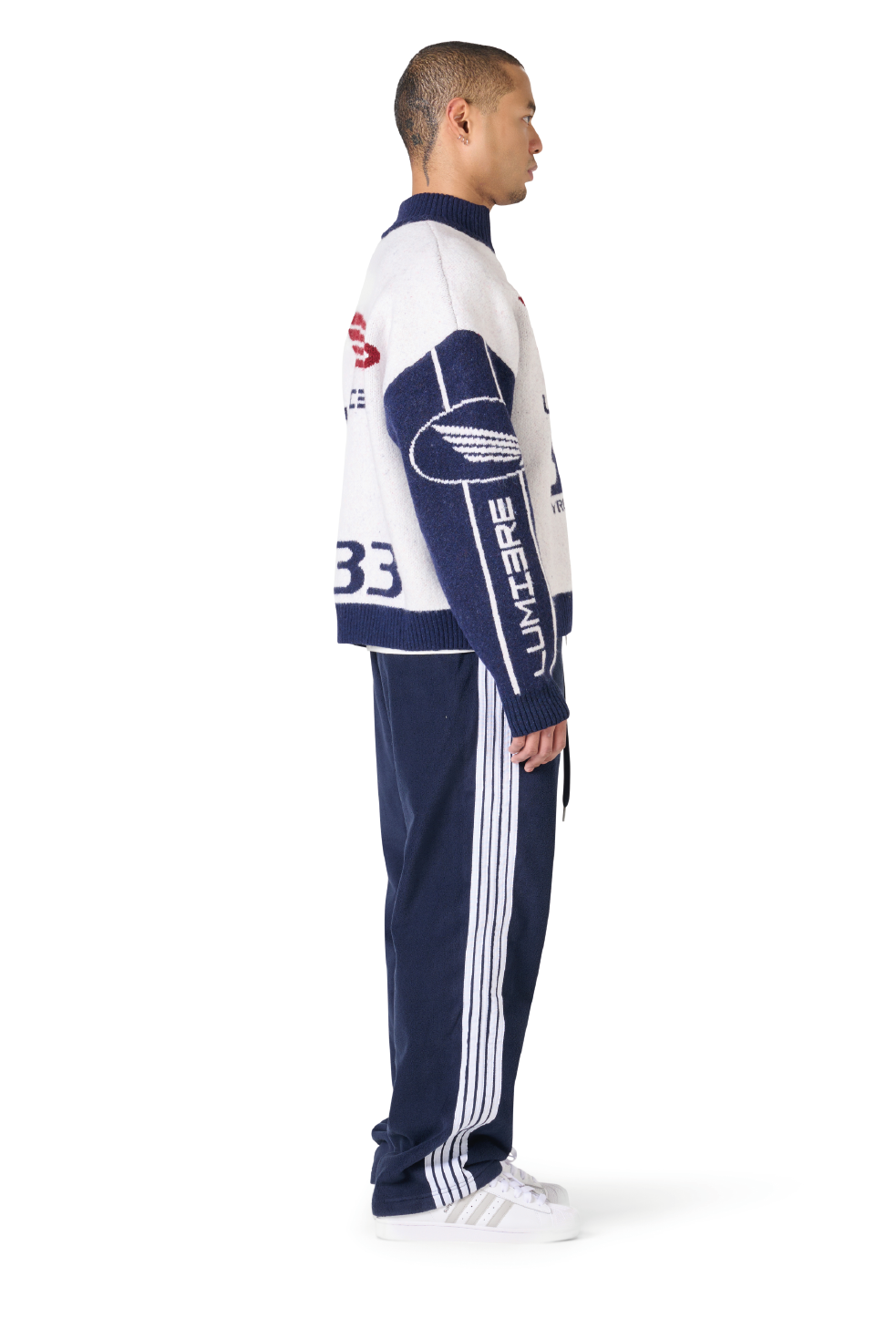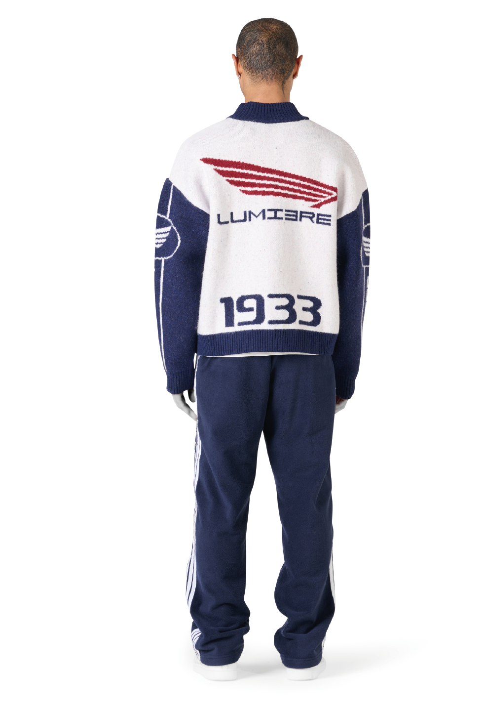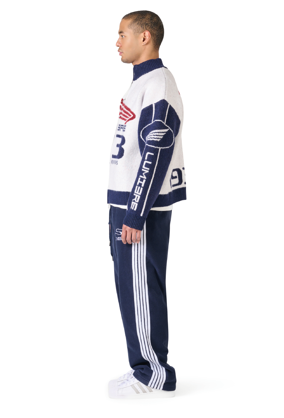 The Knitted Tyres Jacket is a timeless essential within the collection. Sharing the same fit and high-collar design as the Race Jacket, it features a structured silhouette, zipper closure, and multiple Lumi3re logos. The white and navy colorway delivers a clean, classic finish.