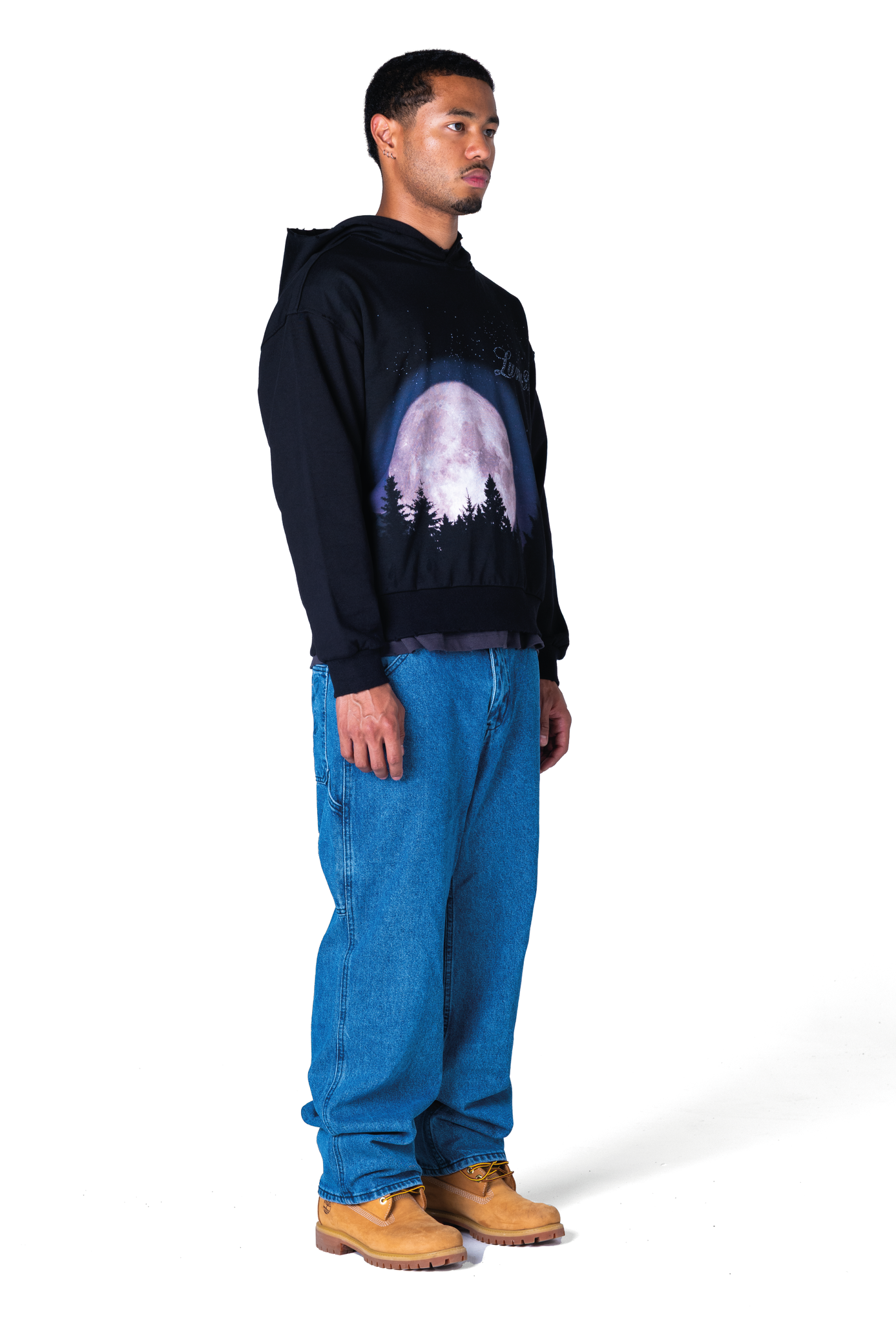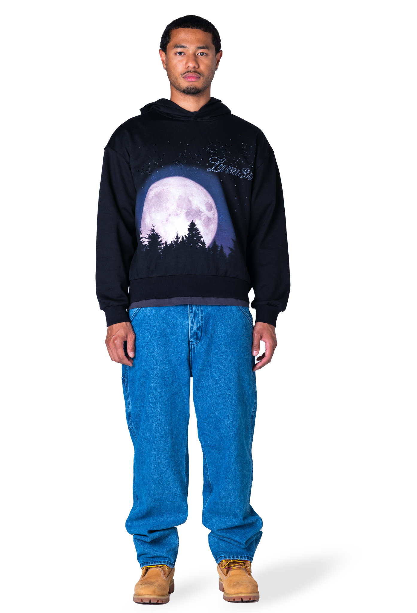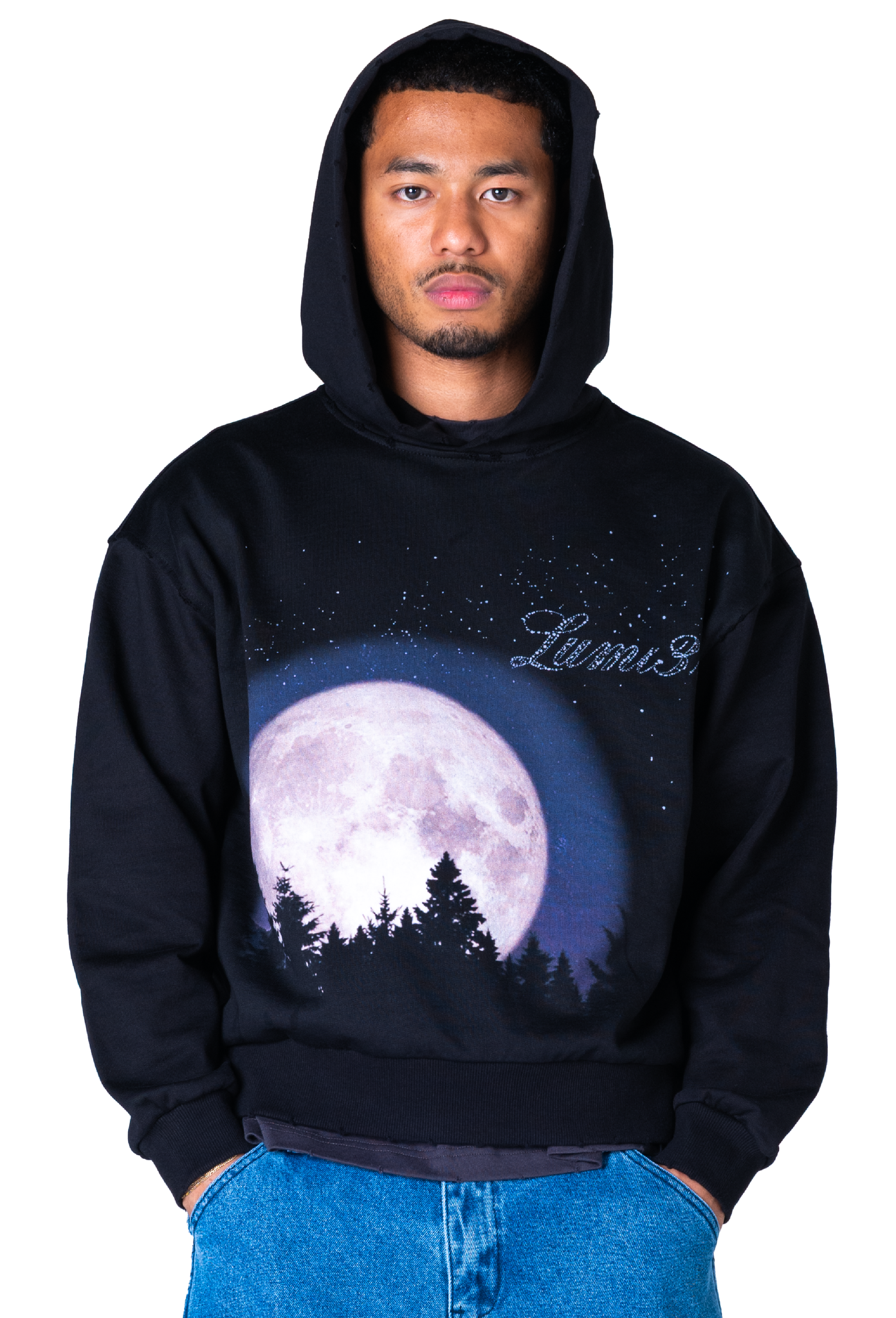 Reach for the stars with the Moon Hoodie in black, part of the Summer Edition by Lumi3re. Crafted from 100% cotton and designed with a boxy fit, this comfortable hoodie is ideal for layering during transitional weather. The front features a clean moon graphic print alongside the Lumi3re logo, combining minimal style with urban character.